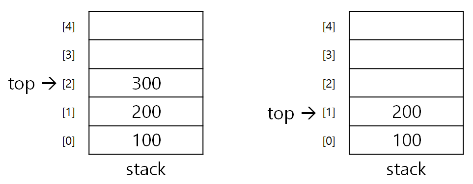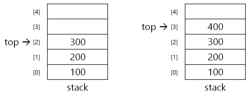 : 스택에서 top을 삽입하는 연산을 'push', top을 삭제하는 연산을 'pop' 이라고 한다. - 자료를 삽입할 경우 top을 증가시키고, 삭제 시 감소 시킨다.