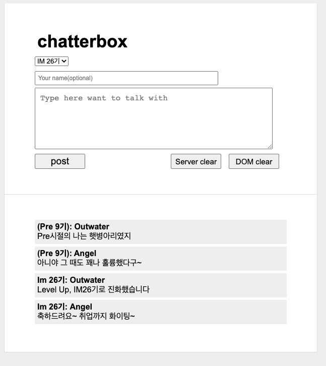 - post 버튼 클릭 시 실행되는 함수 : 서버에 메세지 보내고, DOM을 지운 후, 다시 데이터를 받아와서 렌더링 하는 순서로 이루어짐