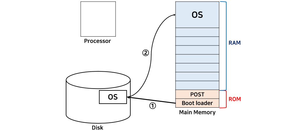 POST작업 이후 바로 실행되는 부트로더는 하드디스크에서 운영체제를 찾아 RAM(메인메모리)에 가지고 와 실행한다.