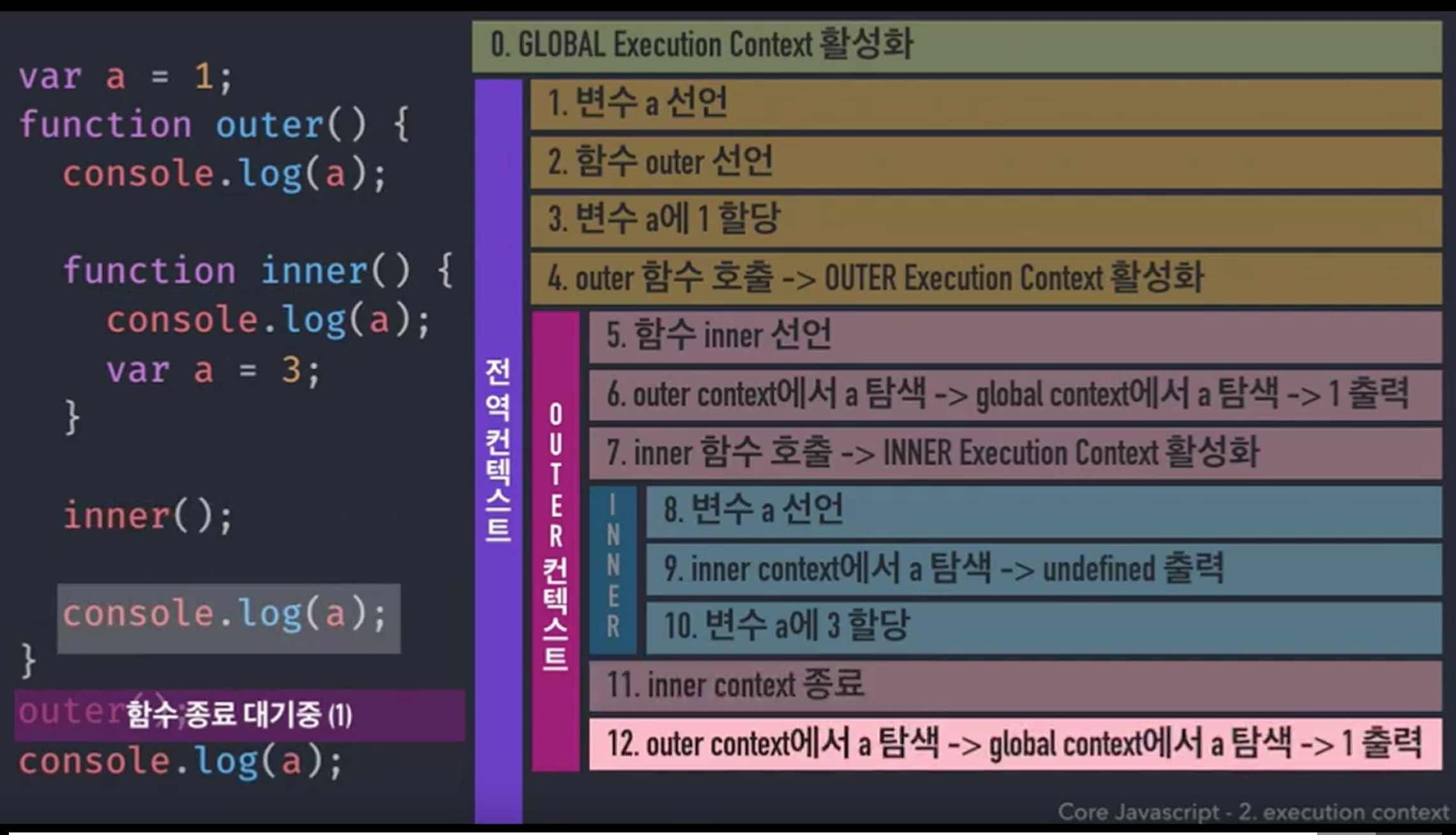 (12): 현재 컨텍스트인 outer 컨텍스트에서 a 탐색 -> 전역컨텍스트에서 a 탐색 -> 1출력