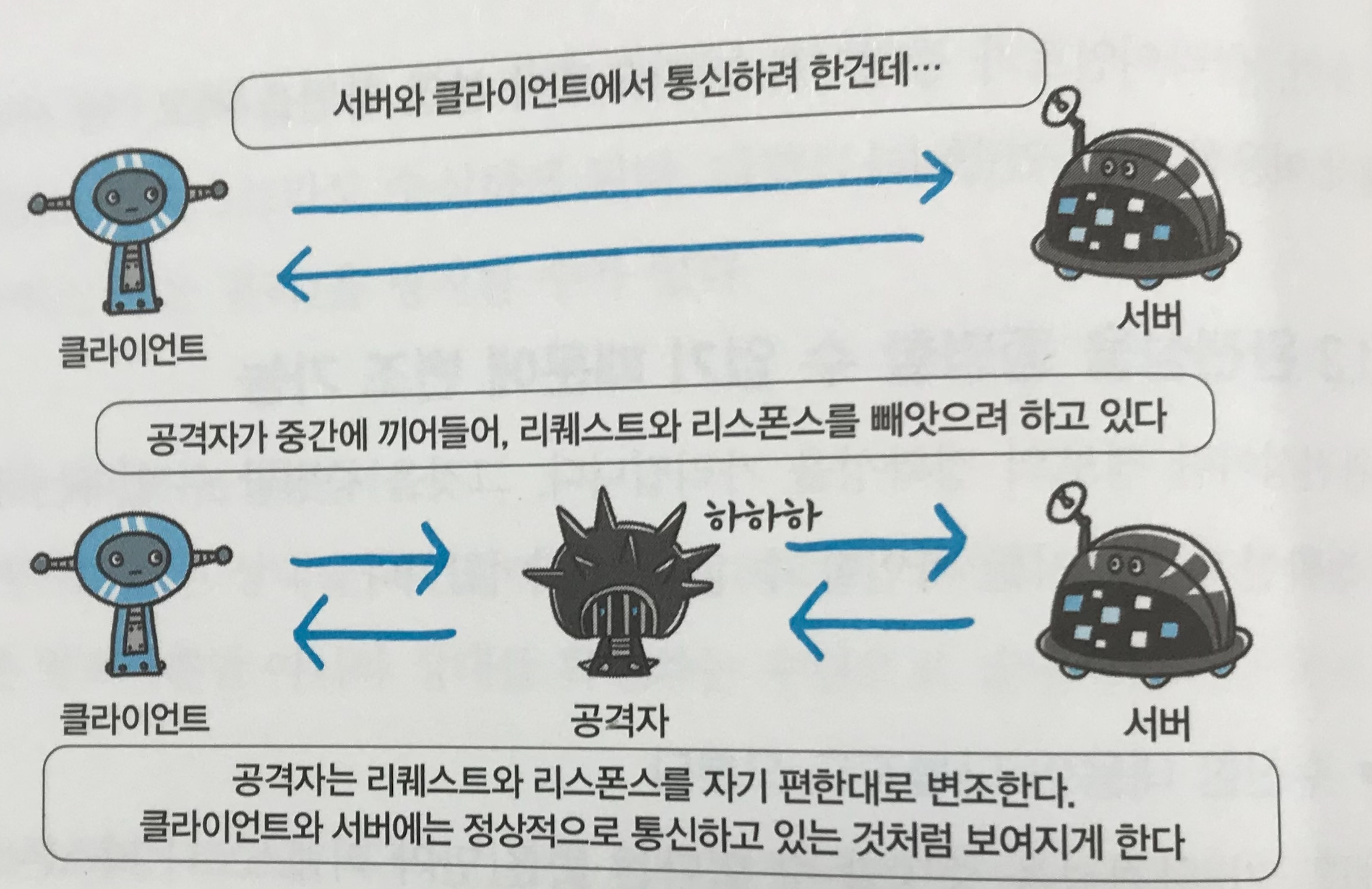 HTTP는 암호화 되지 않는 평문으로 통신을 하고, 통신 상대를 인증하는 수단이 없으며, 통신 과정에서 메세지가 변조될 가능성이 있다.