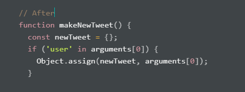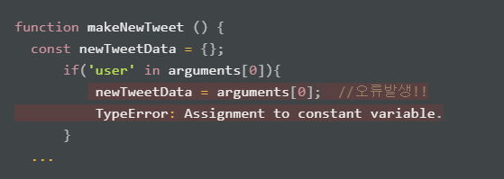 Problem makeNewTweet( randomTweet ) 으로 랜덤트윗을 만들고자 할 때, argument로 들어오는 tweet객체를 새로운 변수 newTweetData에 할당하려고 했지만 상수에 할당할 수 없다는 에러가 발생하였다.