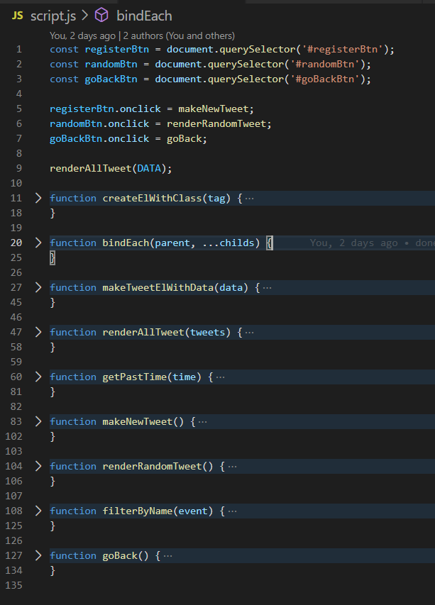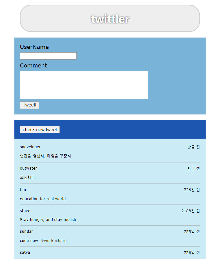 ✔️ 5. 추가 구현 ( 뒤로가기 기능, 트윗작성 이후 경과시간을 표현하는 기능) goBack( ) 작성자 이름을 눌러 필터링하였을 때, 'check new tweet'을 '뒤로가기'버튼으로 바꾸어준다. 각각의 버튼 클릭 시 classList.add('show') 및 classList.remove('show')이용하여 class를 추가 및 제거해주고 css로 display 컨트롤 함. 버튼 클릭 시 renderAllTweet( DATA )로 기존DATA배열에 있는 tweets 들을 렌더링해주는 것으로 구현 getPastTime( ) Data() 객체를 이용하여 현재시간과 트윗이 작성된 시간의 차를 구하여 이를 초, 분, 시간, 일로 분류하고 상황에 맞게 반환시켜준다.